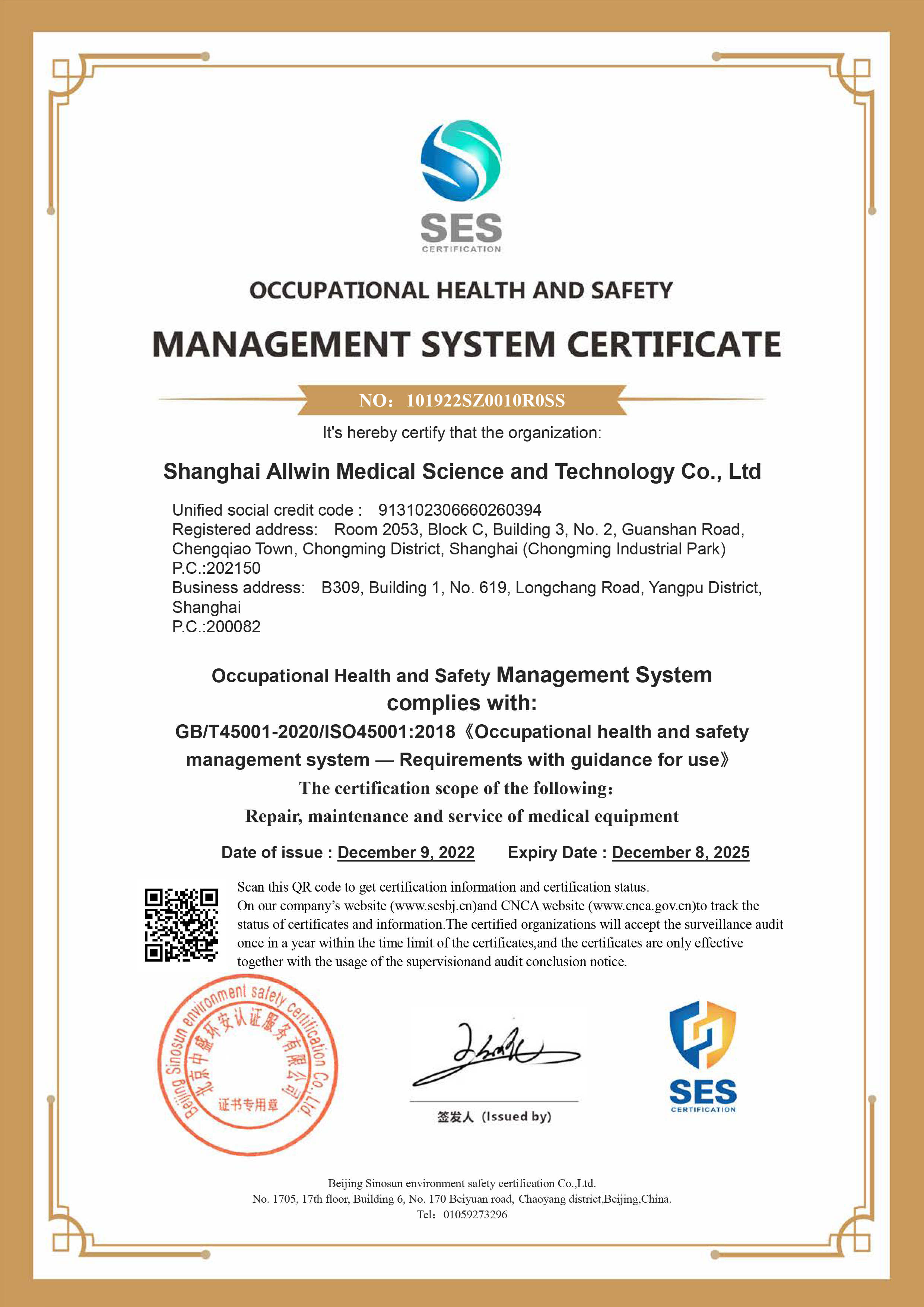 职业健康安全管理体系认证证书