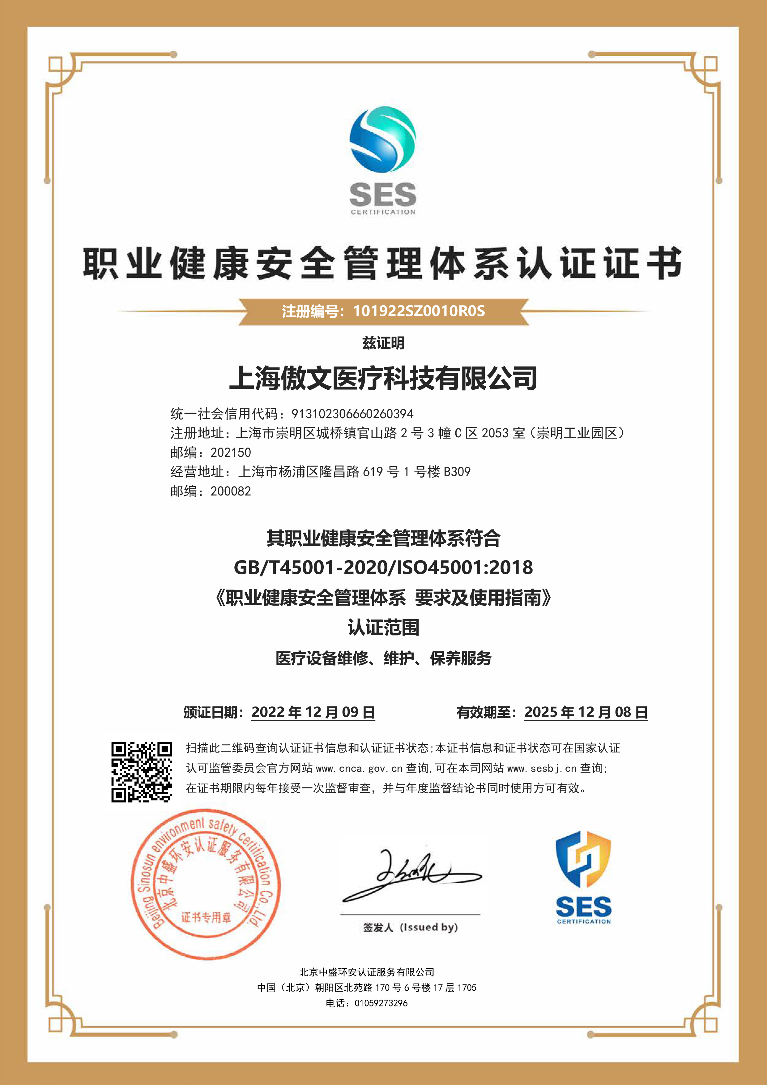 职业健康安全管理体系认证证书